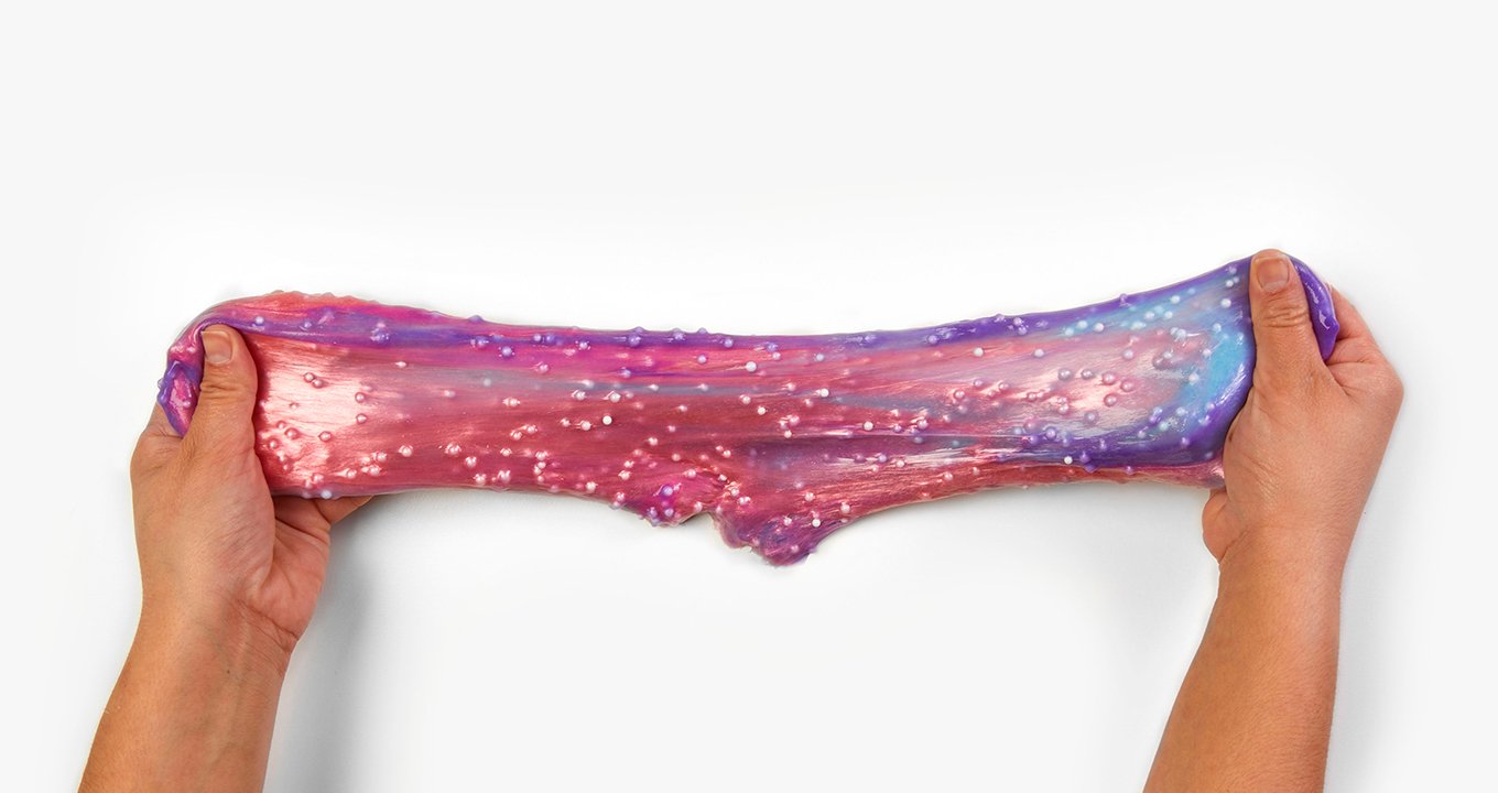 For the remaining glue, repeat steps 1–4. 6. Once both colours are created, lay them on top of each other and add foam beads to your slime, then swirl and twist! If you knead it too much, the colours will eventually mix and become one. Before you knead it too much, go outside and watch part of your slime change colour in the bright sun!
