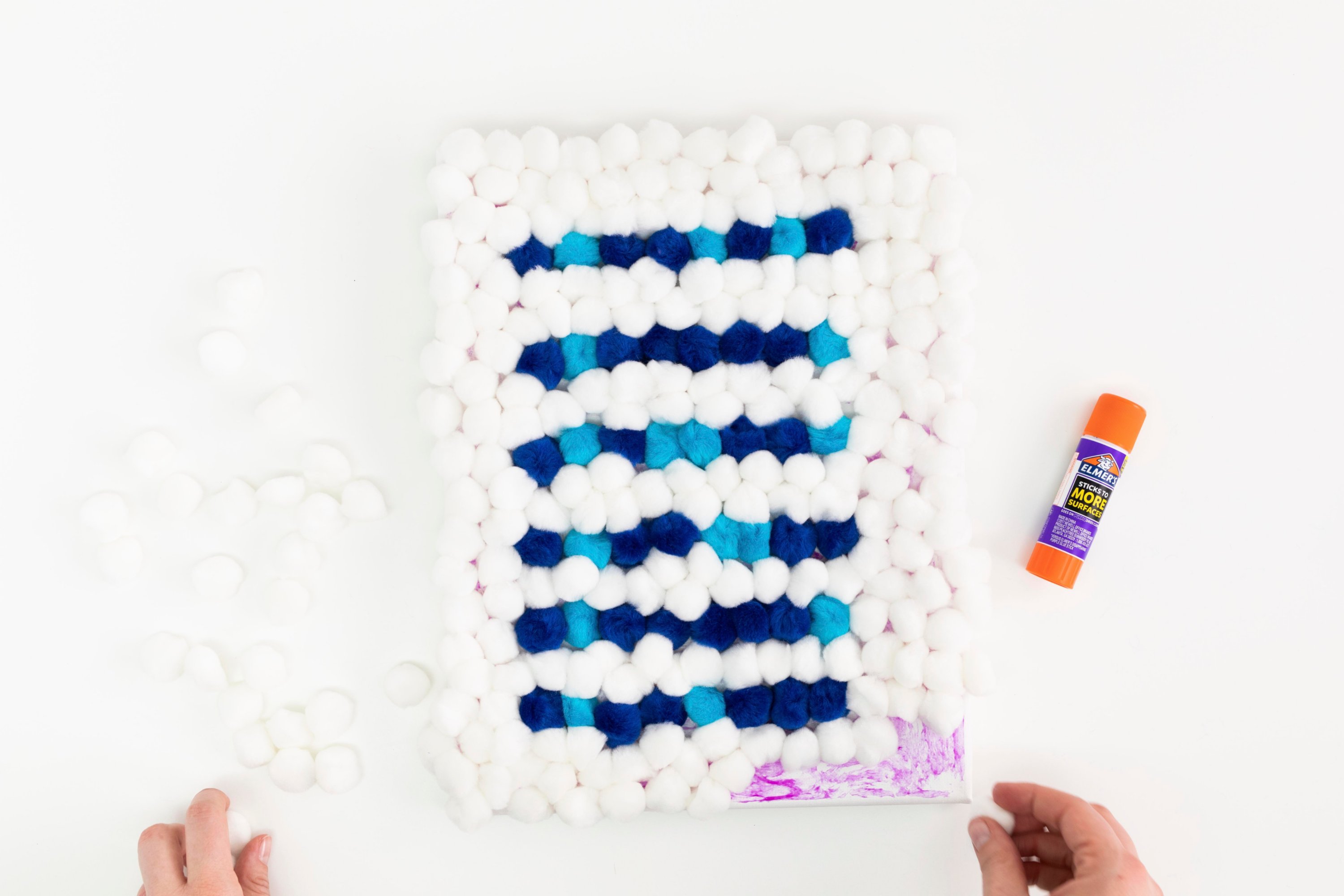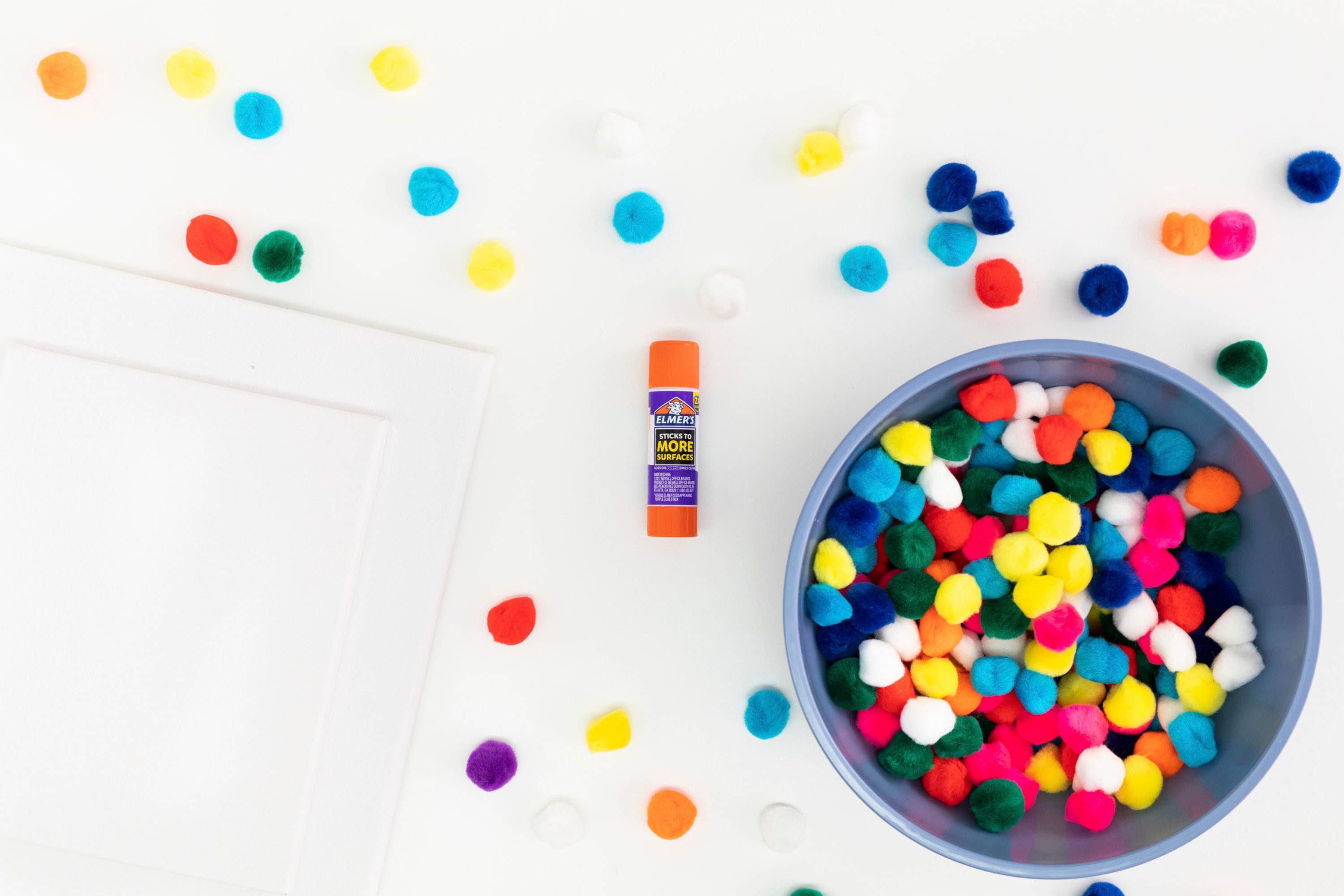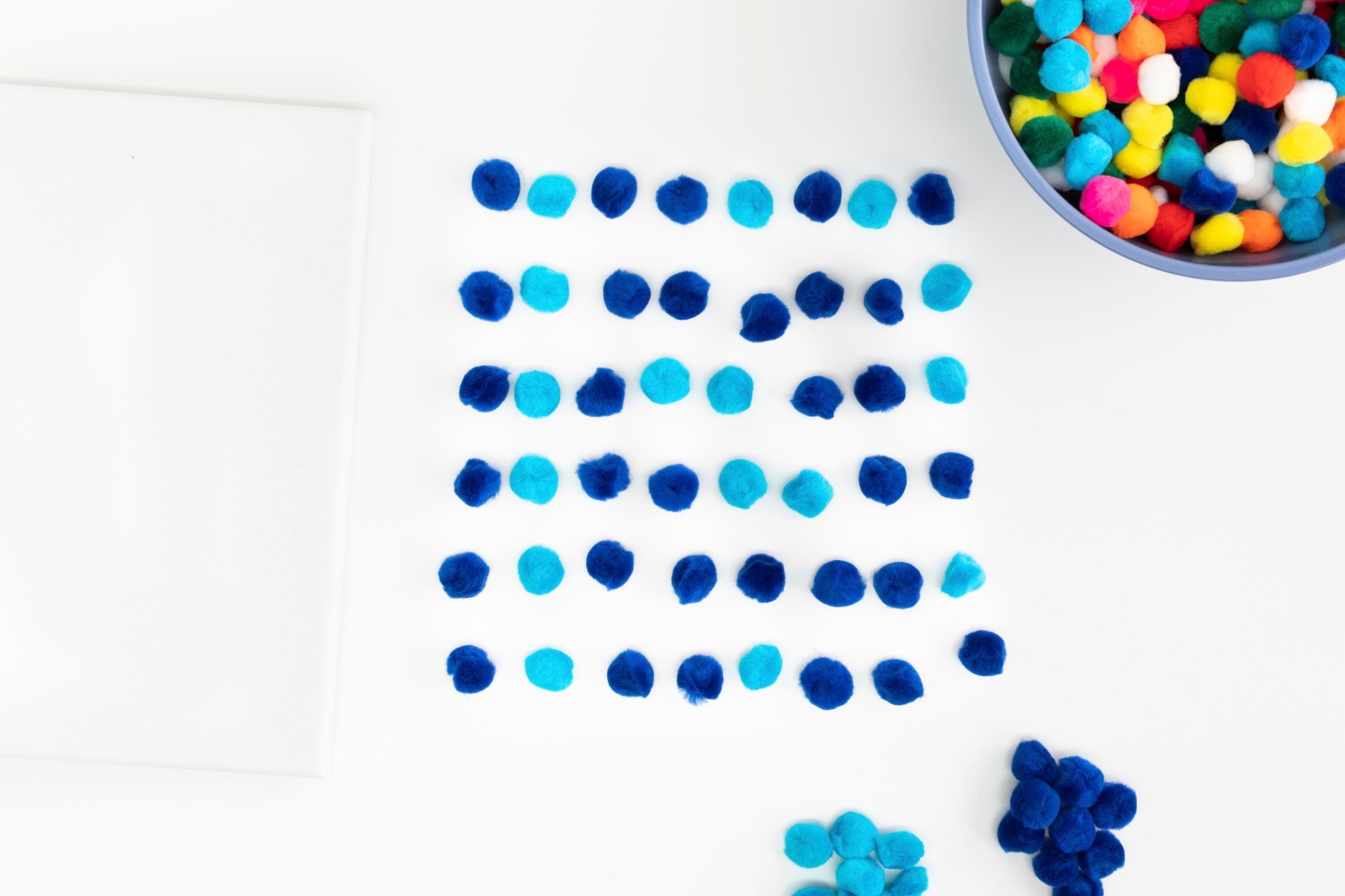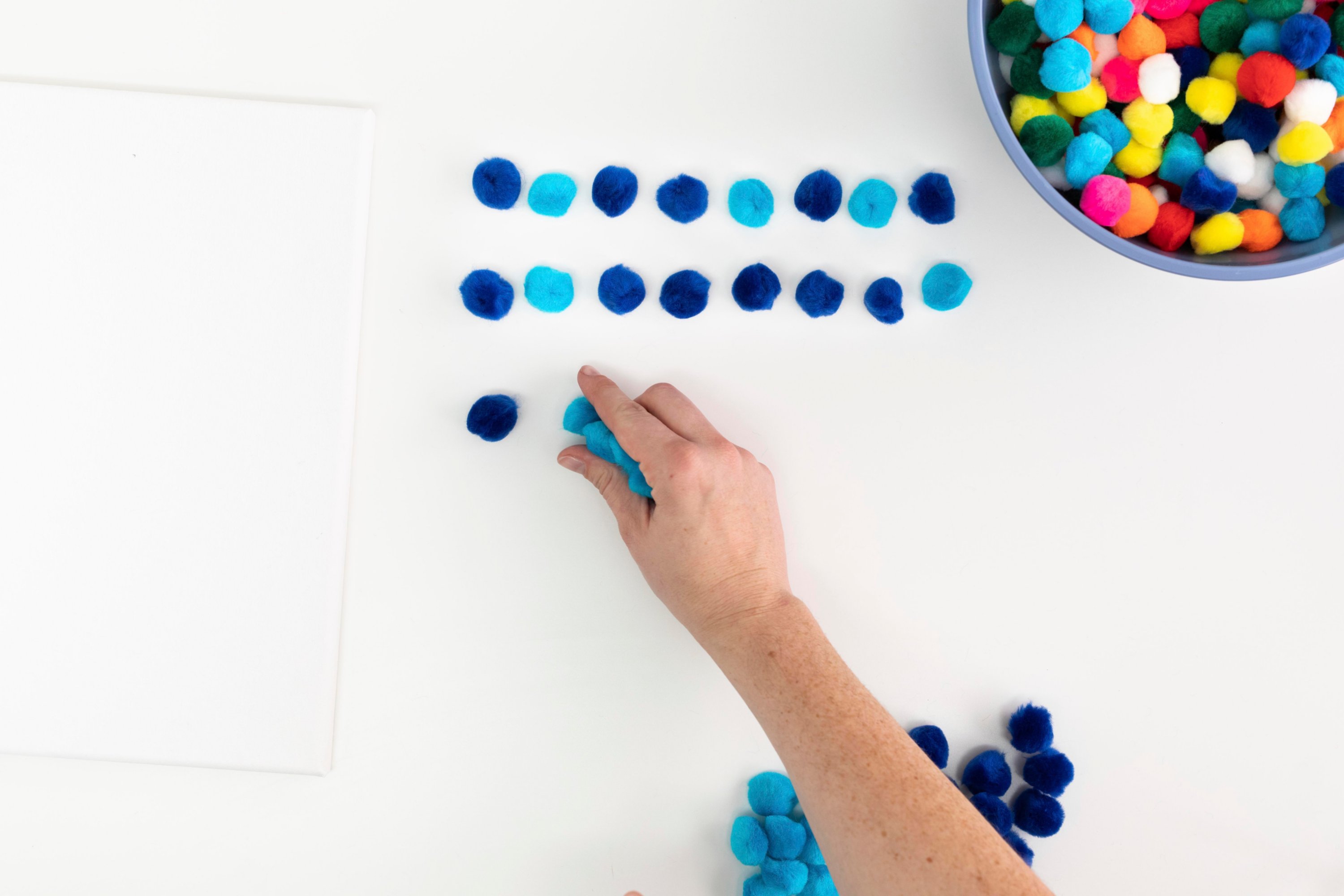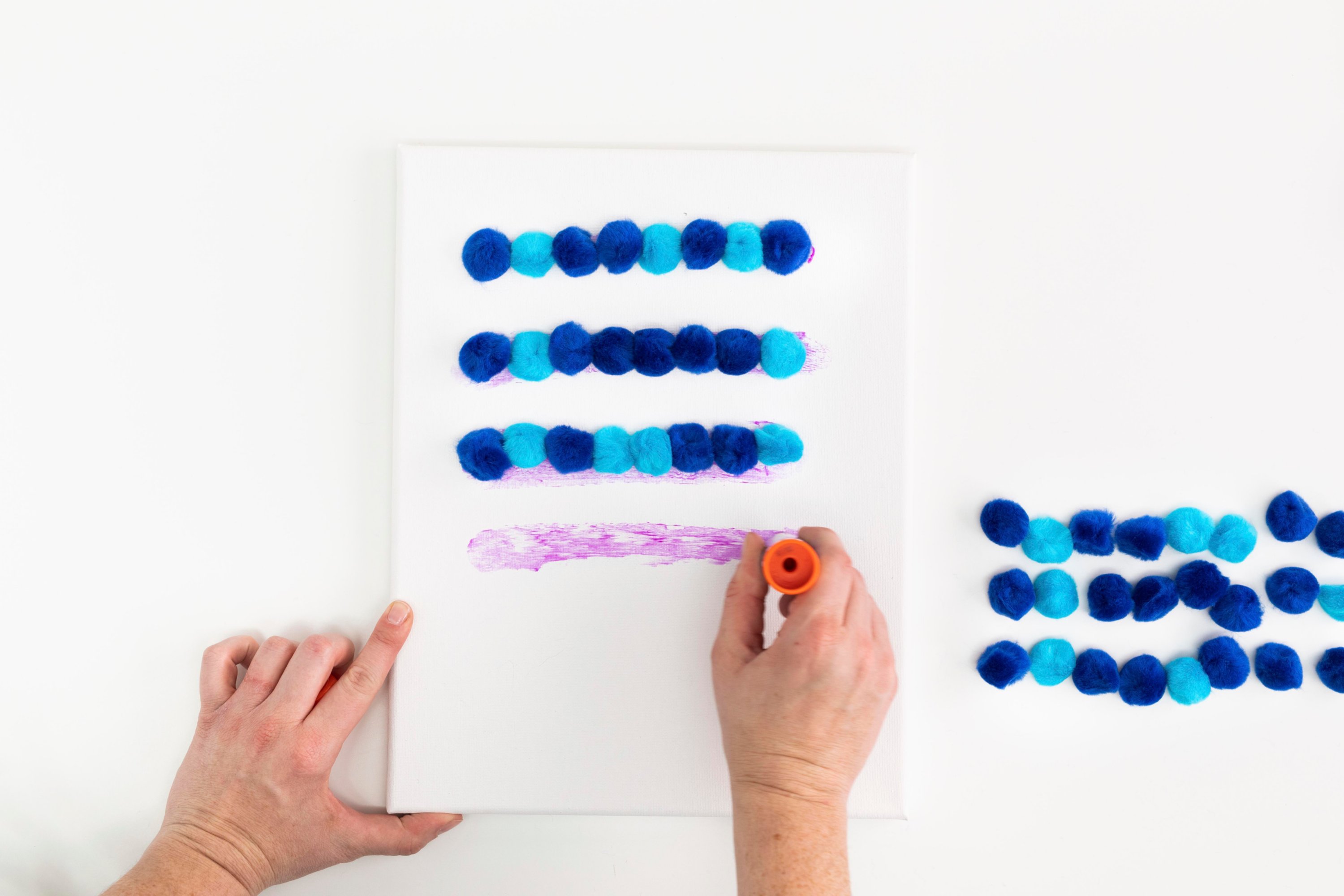 - Use Elmer’s Extra-Strength Glue Stick to create a line of glue on the canvas. Stick your pom-poms to the canvas in order. Go slowly to make sure you don’t mix up the order. (Now you can see why code-crackers are known for being mathematical geniuses!)