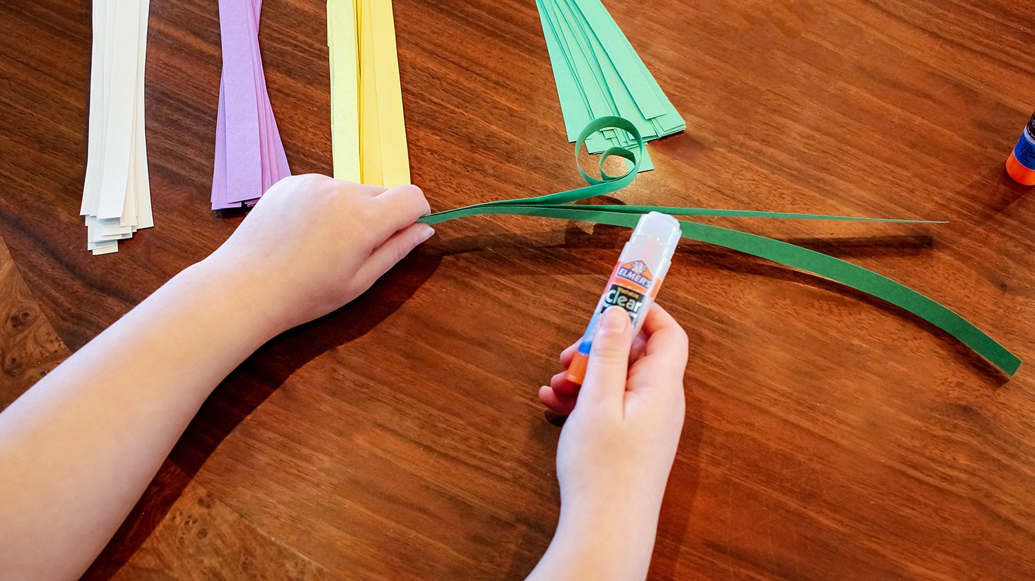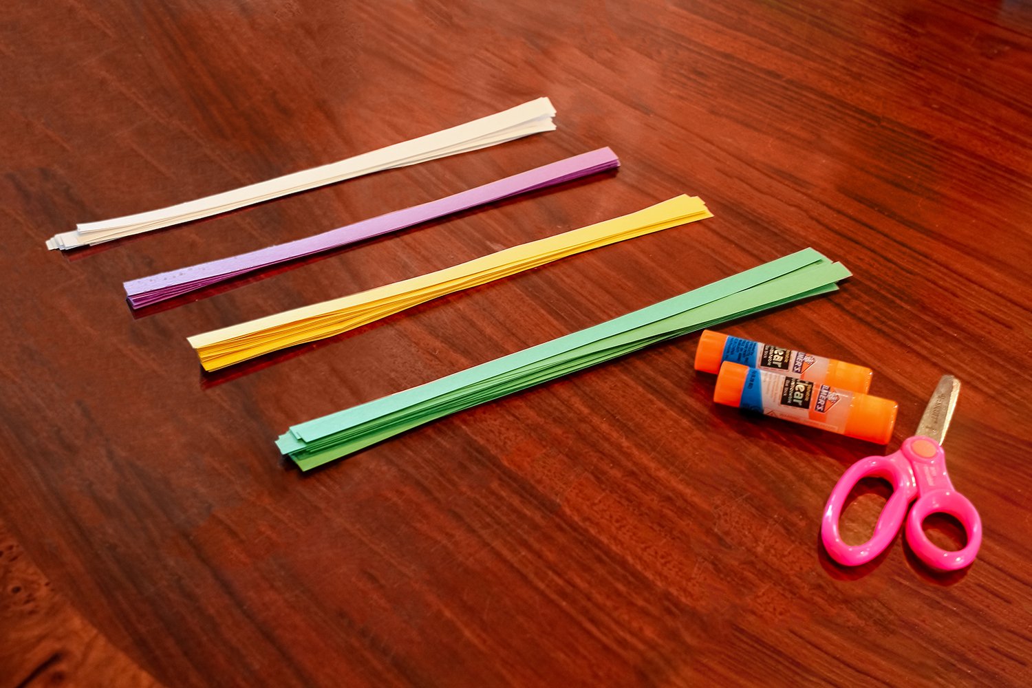 Cut each of your coloured paper sheets into approximately 2-cm strips. Designate one colour for stems, one for petals and one for the centre of the flower. You’ll need approximately 5–7 strips for your petals, 1 for your centre, and 3 for the stem.